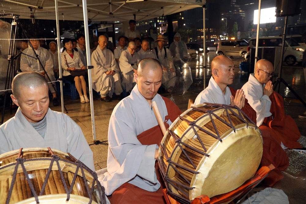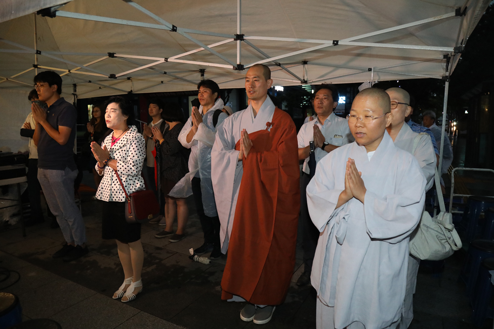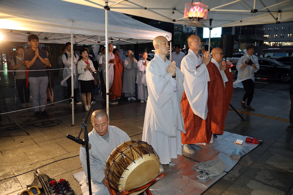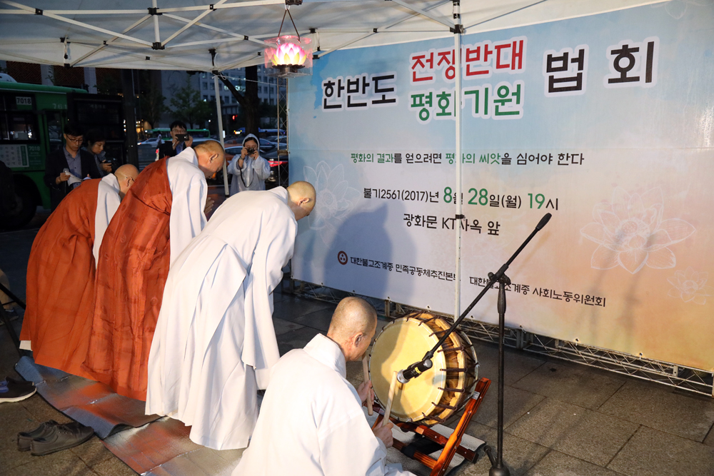 조계종 민족공동체추진본부(본부장 법타스님)와 사회노동위원회(위원장 혜용스님) 주최로 오늘(8월28일) 오후7시 서울 광화문 KT사옥 앞에서 봉행된 한반도 전쟁반대·평화기원법회에 참가한 사부대중은 이같이 발원했다.