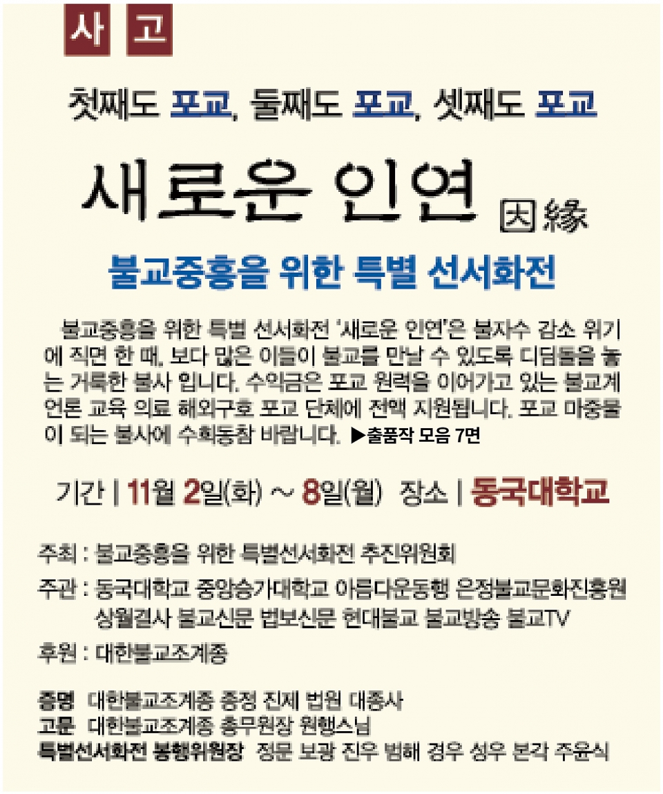 불교중흥을 위한 특별 선서화전 ‘새로운 인연’은 불자수 감소 위기에 직면한 때, 보다 많은 이들이 불교를 만날 수 있도록 디딤돌을 놓는 거룩한 불사입니다