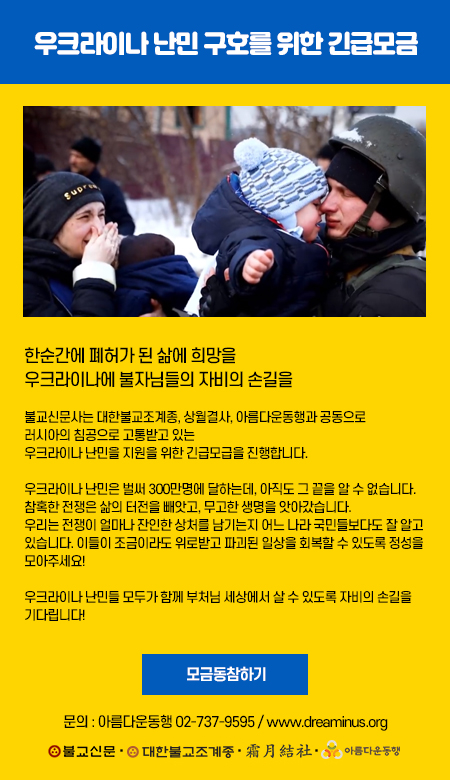불교신문사는 대한불교조계종, 상월결사, 아름다운동행과 공동으로 러시아의 침공으로 고통 받고 있는 우크라이나 난민 지원을 위한 긴급모급을 진행합니다.