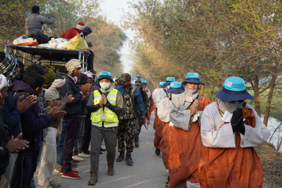 날씨는 꽤 차가웠다. 여명이 밝아 올 무렵 기온이 더 내려가다가 일출 무렵 가장 추워진다. 이 때가 순례단이 거리에서 해결하는 아침 공양시간이다. 평소 아침은 계란 두 알, 사과, 바나나, 견과류 등 간편식이다. 그런데 이 날은 국수가 나왔다. 스님들이 하도 좋아해서 보기만 해도 저절로 웃음이 핀다는 승소(僧笑)다. 김이 모락 모락 피어오르는 뜨거운 국물, 하얗게 삶은 면, 김가루, 다진 김치, 잘게 쓴 파를 띄운 간장, 말 그대로 스님들 얼굴에 미소가 퍼졌다. 추위에 떨던 순례단은 따뜻한 국수 한 그릇에 다시 힘을 회복했다.