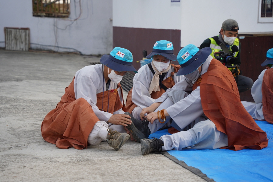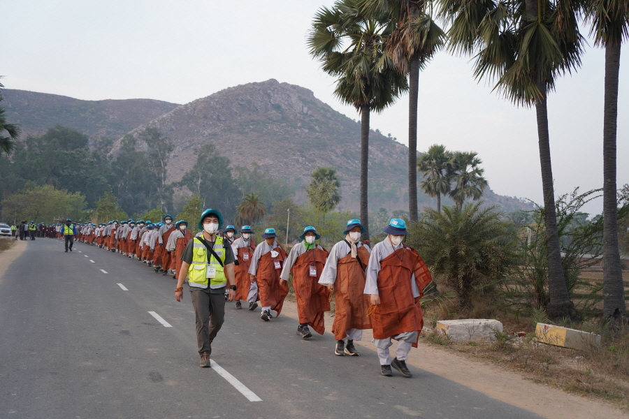 15일 차 행선 역시 길은 멀고 불편했다. 모래가 발을 붙들고 앞뒤로 달리는 차량은 안전을 위협했다. 3월이 다가오면서 날은 점점 더 뜨거워졌다. 하루를 쉬었지만 쌓인 피로를 풀기에는 많이 모자란 듯 목적지를 10여 km 앞둘 즈음에는 발걸음이 느려지고 몸도 많이 휘청거렸다. 아직 절반도 안 지났지만, 몸은 이미 많이 지쳤다. 정신력 만이 힘이다. 정신력을 지탱하는 힘은 진심이다. 부처님은 불을 섬기는 카사파 형제 중 맏형에게 “당신은 과연 진실된 성자인가?”라고 물었다. 그 순간 그는 자신이 최고의 교단 지도자라는 교만에서 벗어나 부처님께 무릎 꿇었다. 수자타 여인이 일면식도 없고 숱하게 많은 수행자 가운데 한 사람인 싯다르타를 지극한 마음으로 공양한 것도 사람에 대한 진실 된 마음을 지녔기 때문일 것이다. 순례단을 걷게 하는 힘도 진심이다. 이 한 걸음 한 걸음이 정말로 한국불교를 중흥하는 생명존중의 길임을 한 치의 의심 없이 믿는 그 마음이다. 육신이 힘들수록 마음은 가볍고 단순해진다. 오직 순례 생각 뿐이다.
