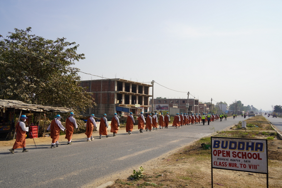 세상이 이 진리를 받아들일 것인가 고민하며 지친 몸을 이끌고 홀로 떠났던 보드가야에서 사르나트의 외롭고 불투명했던 길. 60여 명의 제자와 함께 사르나트에서 보드가야로 가는 ‘전법의 길’, 1250명의 제자와 함께 가는 보드가야에서 라즈기르로 가는 길. 순례단도 라즈기니로 간다. 전정각산 전체가 보이더니 점차 희미하게 멀어져간다. 가야 외곽을 지나 초중고등학교가 함께 있는 학교에서 잠시 휴식을 취하고 다시 길을 나서 목적지 카이야의 한 학교에 도착했다. 보드가야, 팔구강(니련선하), 하리잔토리, 카르하리, 카이야 까지 모두 25km를 걸었다.