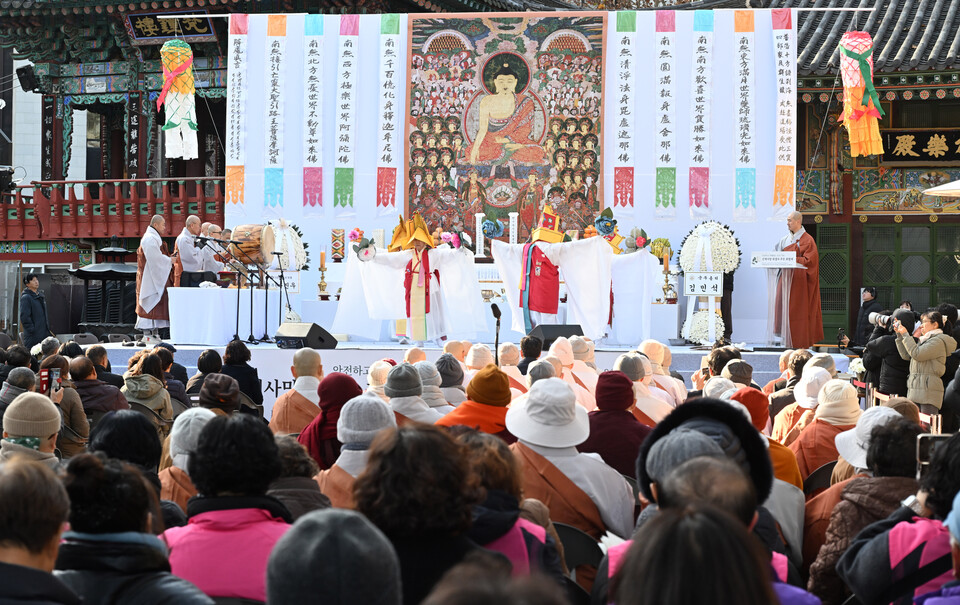 총무원장 진우스님은 “이주노동자들은 한국 경제의 뒤편에서 가장 위험한 일터를 묵묵히 감당한 분들이지만 고용허가제의 틀 속에서 사업장 이동조차 마음대로 하지 못하고 무차별 단속에 다치거나 목숨을 잃기도 한다”며 이주노동자의 영혼 또한 위로했다.
