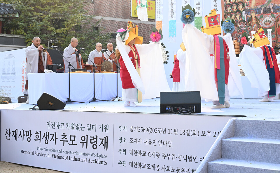 조계종(총무원장 진우스님)이 산업재해로 사망한 희생자의 극락왕생과 안전한 일터 조성을 발원하는 법석을 열었다. 조계종은 11월18일 서울 조계사 대웅전 앞마당에서 ‘산재사망 희생자 추모 위령재’를 봉행했다.