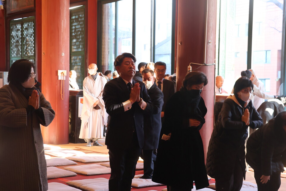 유인촌 문화체육관광부 장관은 11월30일 오후3시40분경 조계사 대웅전을 방문해 자승대종사 영단에 예를 올렸다. ‘자승 큰 스님의 극락왕생을 발원합니다’라고 방명록에 적은 뒤 유 장관은 삼배를 올리며 조문했다. 유 장관은 “자승대종사님이 총무원장 재직하시던 2009년 문체부 장관으로 인연을 맺은 뒤, 자주 뵙고 고견을 듣고 그랬는데 너무 갑자기 이런 일이 생겨서 황망하다”며 “대종사의 극락왕생을 기원할 뿐”이라고 추도의 말을 전했다. 이 자리엔 정용욱 문체부 종무실장 등도 함께 자리했다.